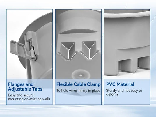 Built for durability and effortless installation, the Togalonn™ Old Work Ceiling Box is crafted from heavy-duty PVC to withstand corrosion, wear, and demanding environments. Its 2.66” depth offers generous space for wiring, while integrated nail brackets ensure quick, rock-solid mounting on studs, perfect for new construction or renovations. Pre-punched knockouts and compatibility with standard clamps or conduits simplify setup, saving time for professionals and DIYers alike. UL-listed and code-compliant, it guarantees safety and reliability for switches, outlets, or devices in homes or light commercial spaces.